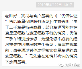 可是,马先生买车之前到底有没有向工作人员交代自己“不要调过表的车”,马先生自己手里没有任何证据,优信二手车方面也不承认。