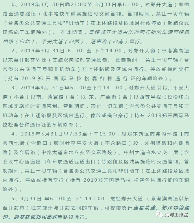 2019中国郑开国际马拉松赛将于3月31日上午,分别在郑开大道和郑东新区商务内环路(含)及以内区域同时进行,交警部门将在当天,对这些区域实施临时交通管制。