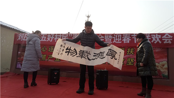村民代表还亲书"厚德载物"赠送给驻村工作队、第一书记刘先权,向驻村干部表示感谢。